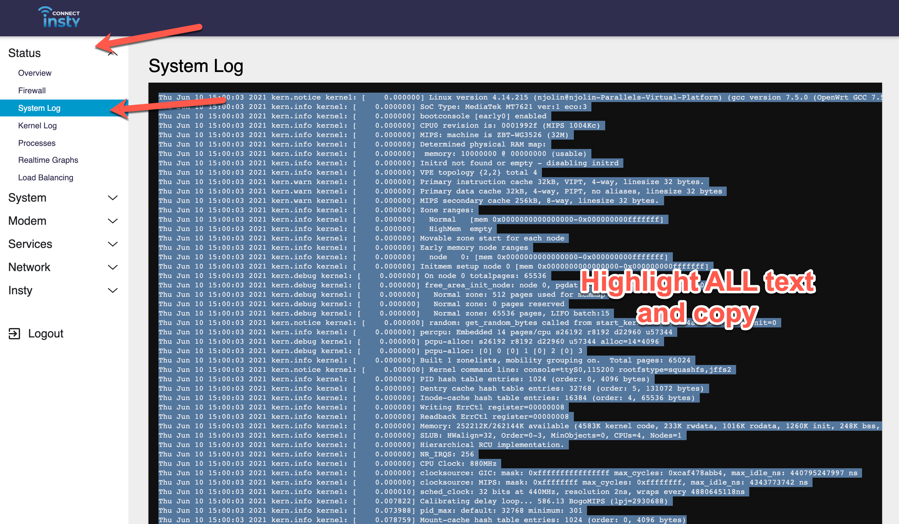 4.) Navigate to Status, System log in the Config section. Highlight ALL text and copy.