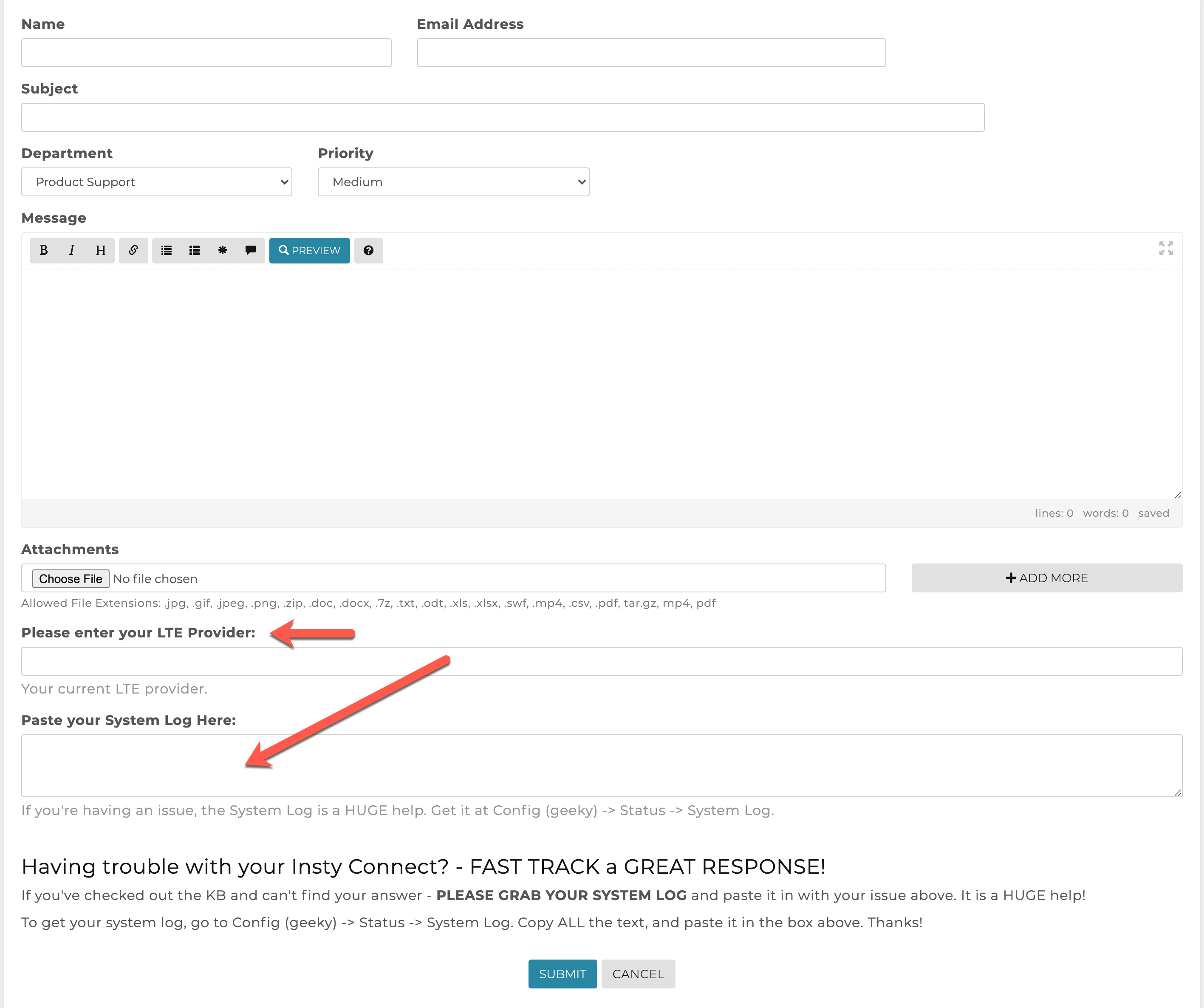5.) In the Insty Connect ticket system, paste your system log in the text box, and please specify the provider you are using: